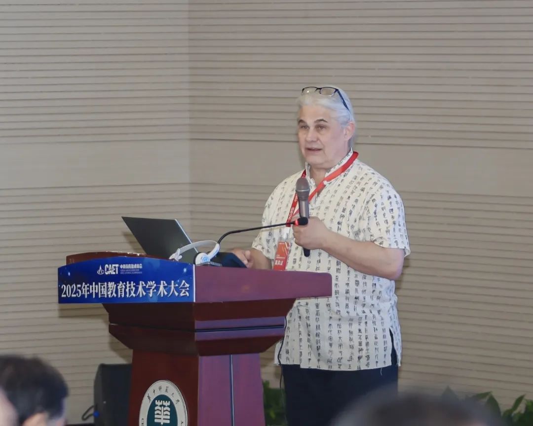 James D. Slotta教授作题为《Classrooms as Learning Communities: Opportunities for Al and Other Technologies》的主旨报告。Slotta教授指出,21世纪的教育需以学生的批判性思维、协作能力、设计与问题解决能力等培养为核心,推动课堂教学从传统“知识覆盖”转向“集体知识共建”的学习社区模式。基于多年的实践,他展示了如何通过多模态学习分析、沉浸式模拟环境及跨学科项目促进学生协作与创新实践发展。最后,Slotta教授提出未来教育需融合物理空间与智能技术,构建支持动态协作与实时反馈的智慧学习环境。